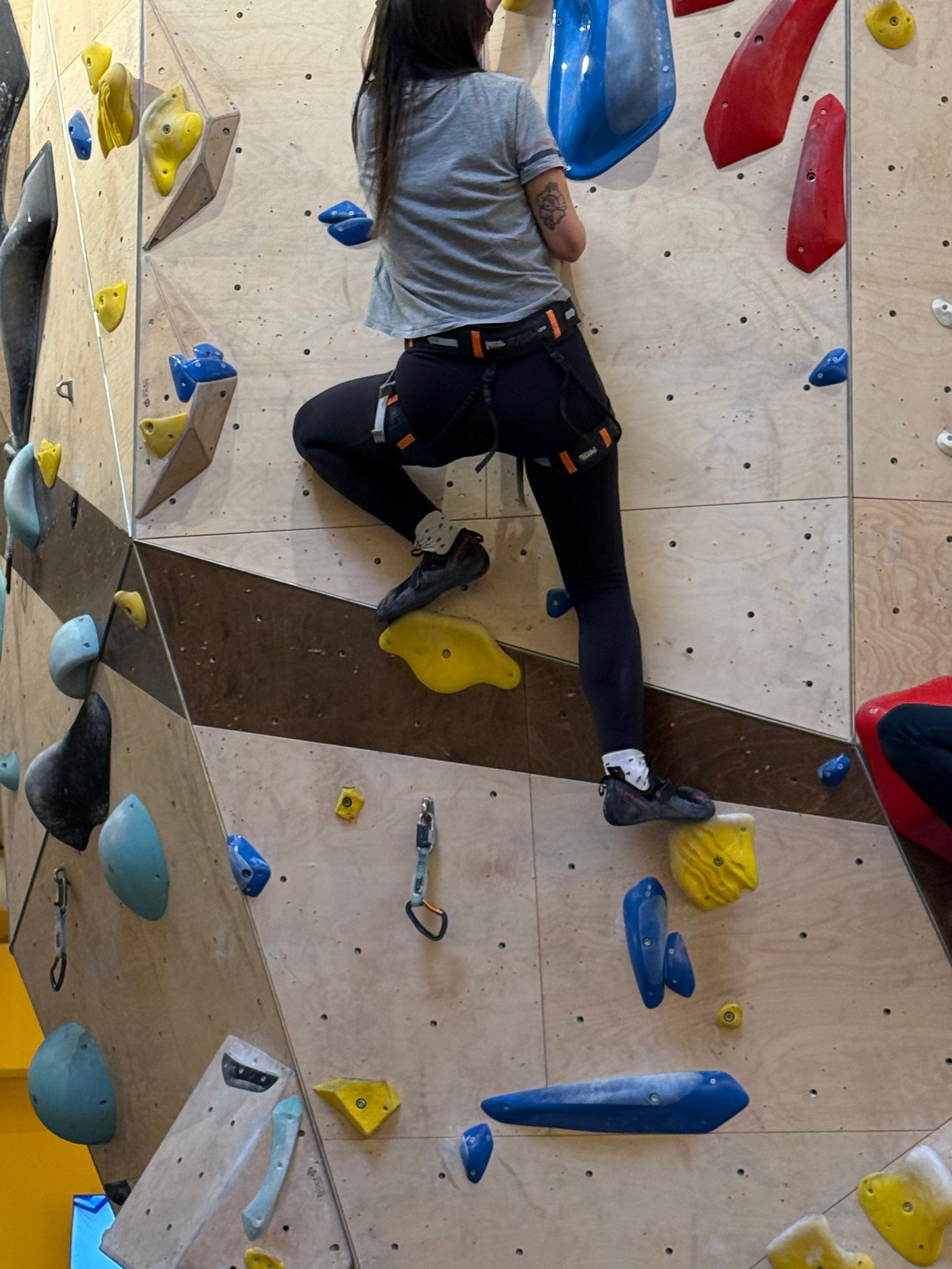 Hace mucho que no sentía los músculos de los antebrazos. Yo entreno, pero les juro que después de hacer bouldering (escalada) me dolieron cosas nuevas. El concepto del bouldering, básicamente, es escalar una pared que tiene distintas inclinaciones y piedras de diferentes colores que indican caminos a seguir e intentar llegar a la cima. Estás atada a un arnés y a una soga que te sujetan a la pared.